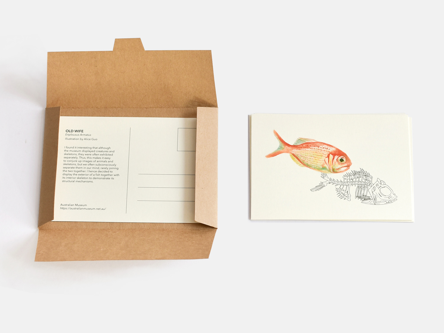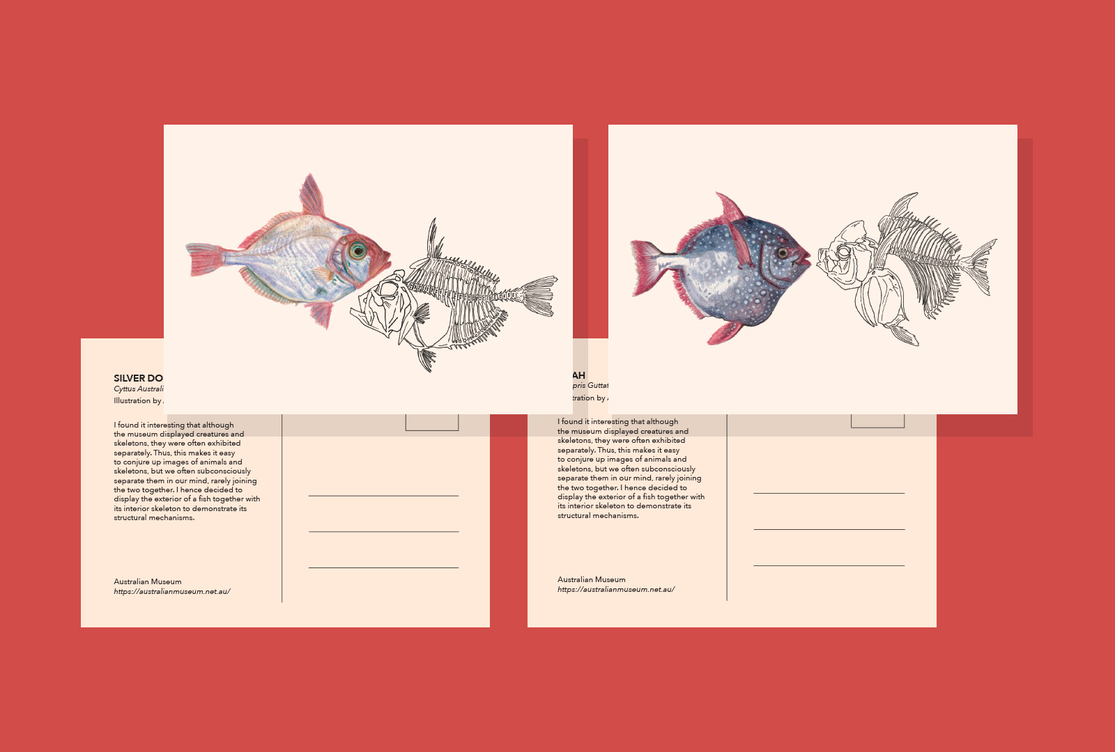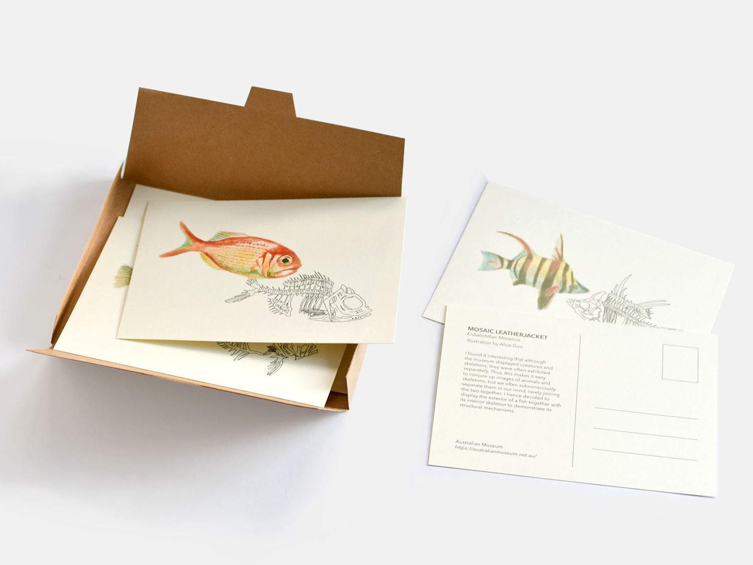 Inspired by my visit to the Australian Museum, I created a series of postcards. I created the illustrations by hand, using watercolour & ink.