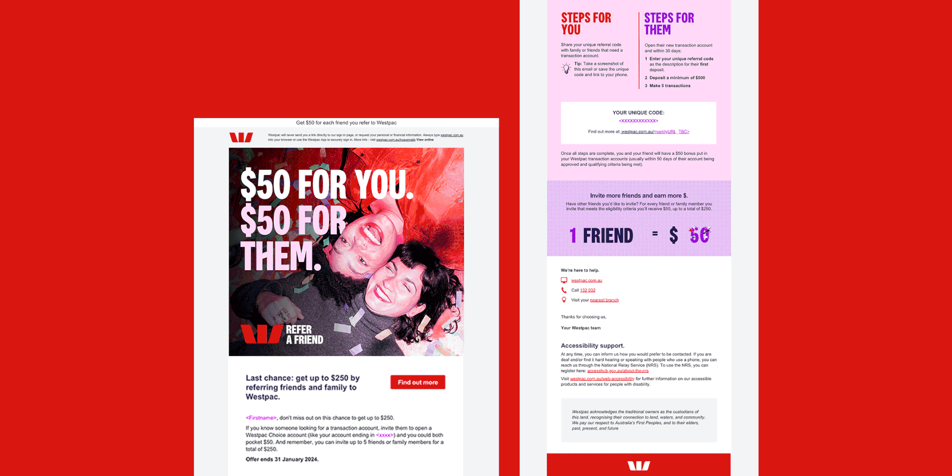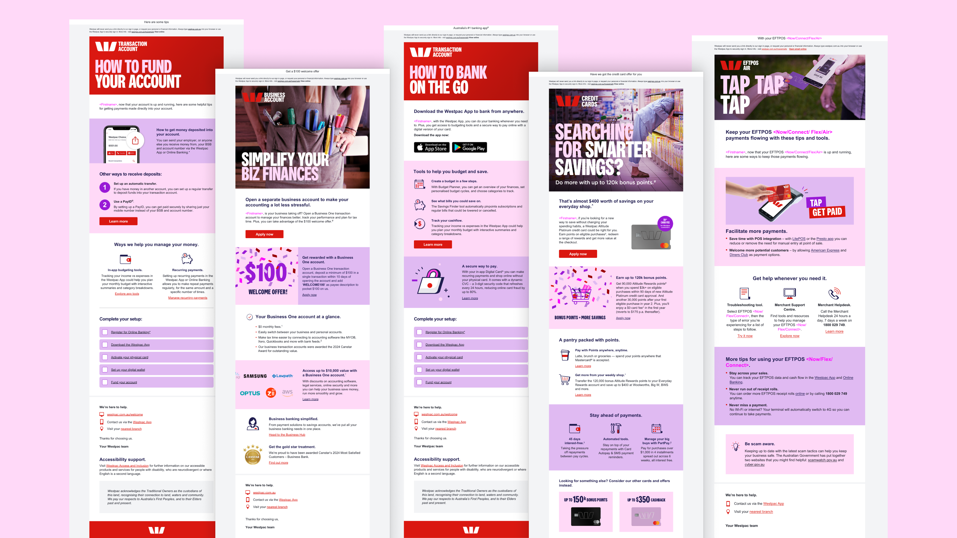 As a key designer on Westpac’s consumer comms, I’ve created and delivered CX projects, marketing campaigns and service communications across eDMs, digital, TVC, OOH, social and more. I also developed new eDM template modules and brand guidelines to align with Westpac’s evolving brand.